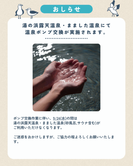 おしらせ 9/24(水)島内の温泉ご利用不可のお知らせ 2025/09/16 9/24(水)は、温泉ポンプ交換に伴い湯の浜露天温泉・まました温泉(砂風呂,サウナ含む)がご利用いただけなくなります。 ご不便をおかけしますが、ご協力のほどよろしくお願いいたします。 温泉 最新のお知らせ記事 2026.01.07 1/18(日)島内一部道路交通規制のお知らせ 2026.01.07 📢 渋谷区民の皆様へ 【渋谷区 新島村宿泊サービス事業】ご利用のご案内 お得情報 2025.12.29 🎍新島港船客待合所内施設の年末年始営業時間のお知らせ🎍 前のページに戻る