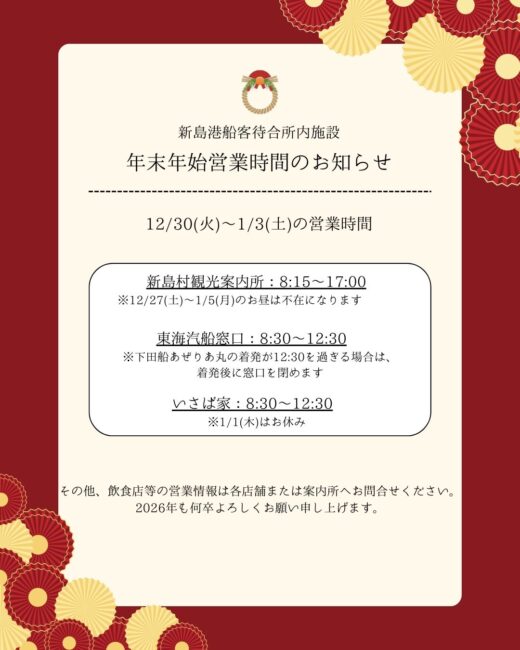 🎍新島港船客待合所内施設の年末年始営業時間のお知らせ🎍