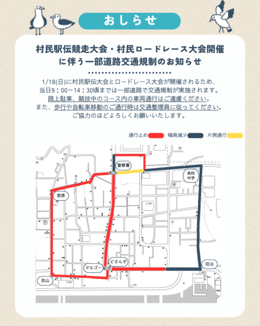 1/18(日)村民駅伝競走大会・村民ロードレース大会開催に伴い、